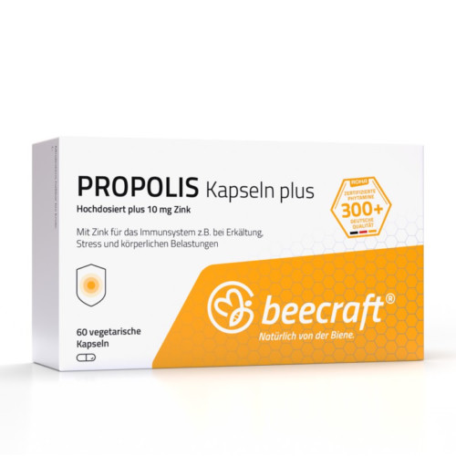 Propolis Kapseln Plus sind hoch dosiert und enthalten Zink, um den Körper und das Immunsystem in Zeiten von Stress, starker körperlicher Belastung oder während einer Erkältung zu unterstützen. Jede Kapsel enthält neben 170 mg Propolis, hergestellt aus 320 mg Roh-Propolis, Zink. Das Spurenelement trägt zu einer normalen Funktion des körpereigenen Immunsystems bei und ist somit eine ideale Ergänzung.