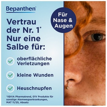 Unterstützen auch Sie Ihre Nase und/oder Ihre Augen bei der Heilung: Bestellen Sie hier noch heute – und rezeptfrei – die Bepanthen® Augen- und Nasensalbe und profitieren Sie von ihren beruhigenden und pflegenden Eigenschaften.