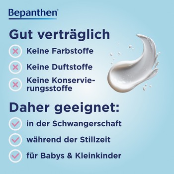 Bepanthen Wund- und Heilsalbe ist effektiv, aber gleichzeitig sehr sanft und gut verträglich. Die Rezeptur ist ohne Duft-, Farb- und Konservierungsstoffe und kann selbst von Schwangeren und stillende Frauen angewendet werden. Die Salbe ist sogar für Säuglinge und Kleinkinder geeignet.
