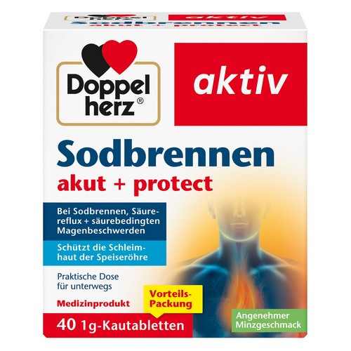 Doppelherz aktiv Sodbrennen akut + protect zur Behandlung von gastroösophagealem Reflux zur Linderung der damit verbundenen Symptome wie Sodbrennen, Sodbrennen in der Schwangerschaft, Refluxösophagitis, saures Aufstoßen, Verdauungsbeschwerden, nächtliche Refluxsymptome, Husten sowie Entzündung von Kehlkopf und Rachen.