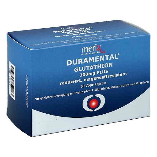 DURAMENTAL® GLUTATHION 300mg PLUS reduziertes, magensaftresistentes und hochkonzentriertes L-Glutathion wurde speziell für meria® auf Basis eines wissenschaftlichen Gutachtens in seiner einzigartigen Wirkstoffkombination entwickelt. Für die optimale Bioverfügbarkeit des oral zugeführten Glutathion sind ausreichende Konzentrationen der Spurenelemente Selen und Zink notwendig, sie aktivieren die erforderlichen Enzyme. Weiterhin ist die Kombination mit den antioxidativen Vitaminen C und E nötig, da die antioxidativen Mechanismen im Körper wie bei einem Orchester zusammenarbeiten. Mangan ist wichtig für den antioxidativen Schutz von Zellbestandteilen und wirkt über die Aktivierung von Glutathionperoxidase in Gegenwart von hinreichend Glutathion. Folsäure unterstützt die Gedächtnisleistung bei zunehmendem Alter, Vitamin B12 in ausreichender Konzentration ist u.a. eine Voraussetzung für die Wirksamkeit von Folsäure.