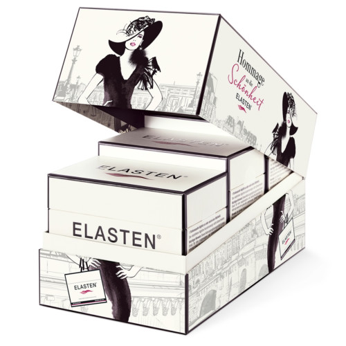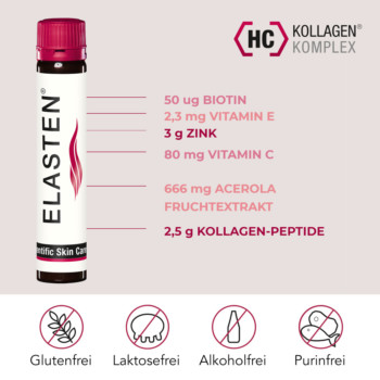 Während Hautpflege bisher meist von außen geschah und diverse Cremes und Ampullen weniger Falten versprachen, gibt es nun einen neuen Ansatz: Kollagen zur Einnahme in Trinkampullen. Mehrere Studien haben gezeigt, dass die Einnahme von Kollagenpeptiden Falten reduziert und aufbauend auf die extrazelluläre Matrix in der Haut wirkt. Zudem wird die Bildung von Fibroblasten angeregt, den Zellen, die Kollagen synthetisieren. Weitere Ergebnisse nach einer dreimonatigen Einnahme von Elasten war eine Verbesserung der Hautfeuchtigkeit und Hautelastizität sowie eine glattere Haut. Die Studienteilnehmerinnen berichten von einem verfeinerten Hautbild, das auch von Außenstehenden wahrgenommen wurde. Der Effekt war nachhaltig: Die Haut blieb auch einen Monat nach Beendigung der Einnahme von Elasten noch elastisch. Ebenso verhielt es sich mit der Hautfeuchtigkeit. Der Geschmack der Acerola-Kirsche macht die Einnahme von Elasten angenehm und erfrischend.