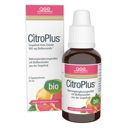 CitroPlus® Bio Grapefruit-Kern-Extrakt ist ein Nahrungsergänzungsmittel zur Versorgung mit Bioflavonoiden aus der Grapefruit. CitroPlus® wird aus biologisch angebauten Früchten hergestellt. Die wichtigsten Inhaltsstoffe sind die sekundären Pflanzenstoffe, die sogenannten Flavonoide wie z.B. Naringin, Isonaringin, Neohesperidin und andere, gelöst in pflanzlichem Bio-Glycerin. CitroPlus® wird standardisiert auf den Anteil an Bioflavonoiden aus der Grapefruit. Der Flavonoidgehalt beträgt 800 mg / 100 ml.