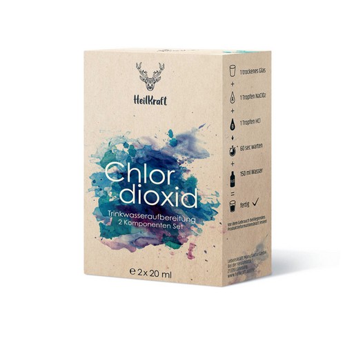 Das 2 Komponenten-Set besteht aus 22,5% Natriumchlorit und 3,5% Salzsäure in Violettglas-Pipettenflaschen zur Herstellung von Chlordioxid oder einer Chlordioxidlösung (CDL). Chlordioxid wird bereits seit langem zur Desinfektion von Trinkwasser oder auch Lebensmitteln eingesetzt.
