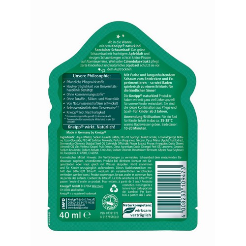 Ab in die Wanne mit dem Kneipp® naturkind Seeräuber Schaumbad! Das grüne Schaumbad mit fruchtigem Apfelduft und riesigen Schaumbergen schickt kleine Piraten auf Abenteuerreise. Wertvoller Calendulaextrakt pflegt zarte Kinderhaut und natürliches Jojobaöl schützt sie vor dem Austrocknen.