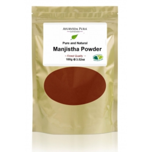 Manjistha (Rubia cordifolia) ist eine Kletterpflanze in Indien und der Name bedeutet: rote Farbe. Diese roten Pigmente sind in der Wurzel enthalten und im Ayurveda hat die Farbe Rot einen Bezug zu Blut, Leber und Haut. Manjisthapulver enthält Polyphenole; das sind bioaktive, sekundäre Pflanzenstoffe, die in Form von Farbstoffen, Geschmacksstoffen und Tanninen den Dosha* Charakter der Pflanzen prägen.