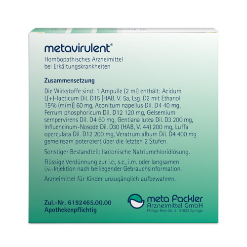 metavirulent® Mischung. Die Anwendungsgebiete leiten sich von den homöopathischen Arzneimittelbildern ab. Dazu gehören: grippale Infekte. Hinweis: Bei Fieber, das länger als 3 Tage anhält oder über 39 °C ansteigt, sollte ein Arzt aufgesucht werden. Enthält 80 mg Alkohol (Ethanol) pro 10 Tropfen, entsprechend 37 Vol.-%.