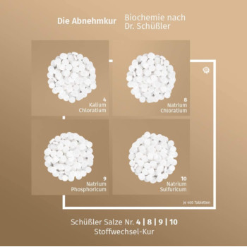 Bei der Schüssler Salze Stoffwechselkur werden die 4 Salze mit der Nummer 4, 8, 9 und 10 miteinander kombiniert.