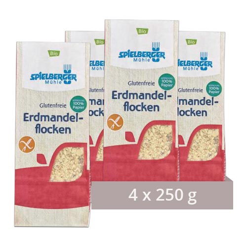 Erdmandeln sind von Natur aus glutenfrei. Damit der Glutengehalt der glutenfreien Erdmandelflocken garantiert unter 20 ppm (20 mg/kg) Gluten liegt, werden sie sorgfältig getrennt von allen glutenhaltigen Produkten gehalten und mehrmals analysiert. Dafür achtet die Spielberger Mühle auf streng getrennte Warenströme und separate Produktionslinien. Erst wenn auch die letzte Analyse die Glutenfreiheit bestätigt, verlassen die Produkte das Haus. Für eine ökologische und sichere Verpackungslösung für die glutenfreien Produkte, setzt der Hersteller auf Pergaminpapier. Dieses ist sehr dicht und besitzt eine Fettbarriere. Bei den Beuteln für die glutenfreien Produkte wird ein kompletter Innenbeutel aus diesem Papier verweendet. Er bietet ausreichend Schutz vor nachträglicher Verunreinigung. Weil er aus 100% Papier besteht, kann er problemlos über das Altpapier entsorgt werden.